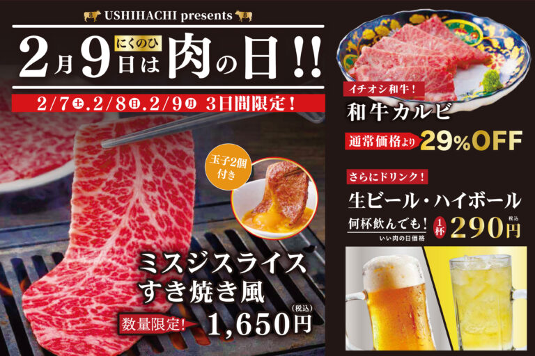 焼肉店「USHIHACHI(ウシハチ)」2月7日(土)より年に一度の『肉の日(2/9)』キャンペーンを開催
